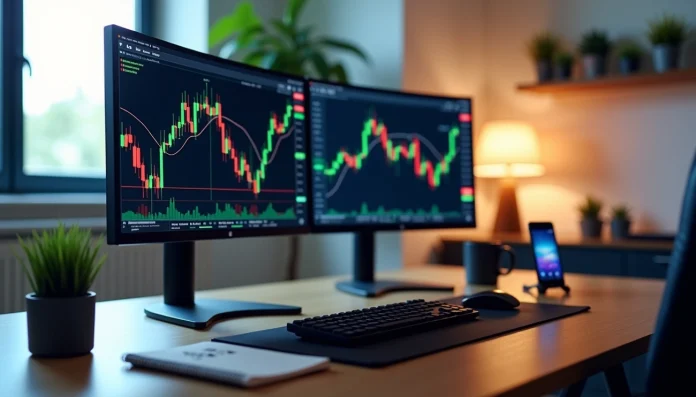 Dual monitor setup displaying cryptocurrency trading charts on a modern desk with keyboard and smartphone stand. ¿Alguna vez has querido probar el trading de criptomonedas sin arriesgar tu dinero real? Un simulador de criptomonedas podría ser exactamente lo que necesitas para dar tus primeros pasos en este mercado volátil.