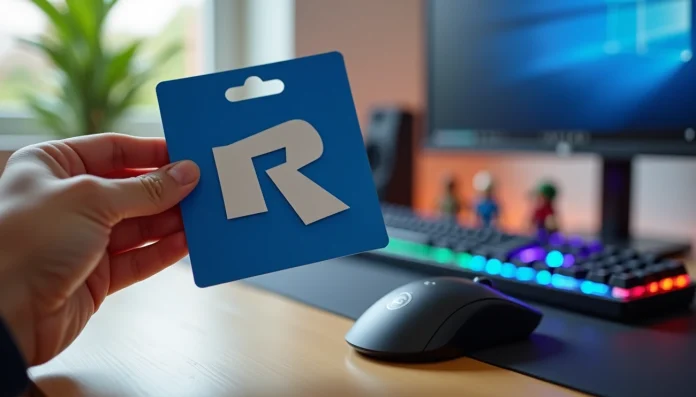 Hand hält eine blaue Roblox-Geschenkkarte vor einer bunten Gaming-Tastatur und einem Monitor auf einem Schreibtisch.Möchten Sie Robux einlösen, wissen aber nicht, wie das richtig geht? Wenn Sie schon einmal eine Roblox-Geschenkkarte besessen haben, haben Sie sich wahrscheinlich gefragt, wie Sie diese richtig in Robux oder Kontoguthaben umwandeln.